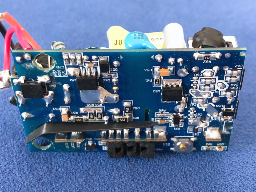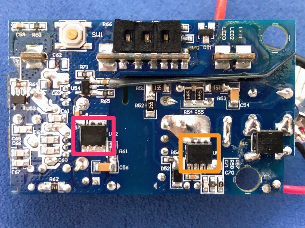 一般的な充電器スイッチング電源の回路とらしく、一次側と二次側に分離されてる様子が見て取れます。下部のLEDとスイッチはそれぞれ充電のインジケータとバッテリースイッチですね。