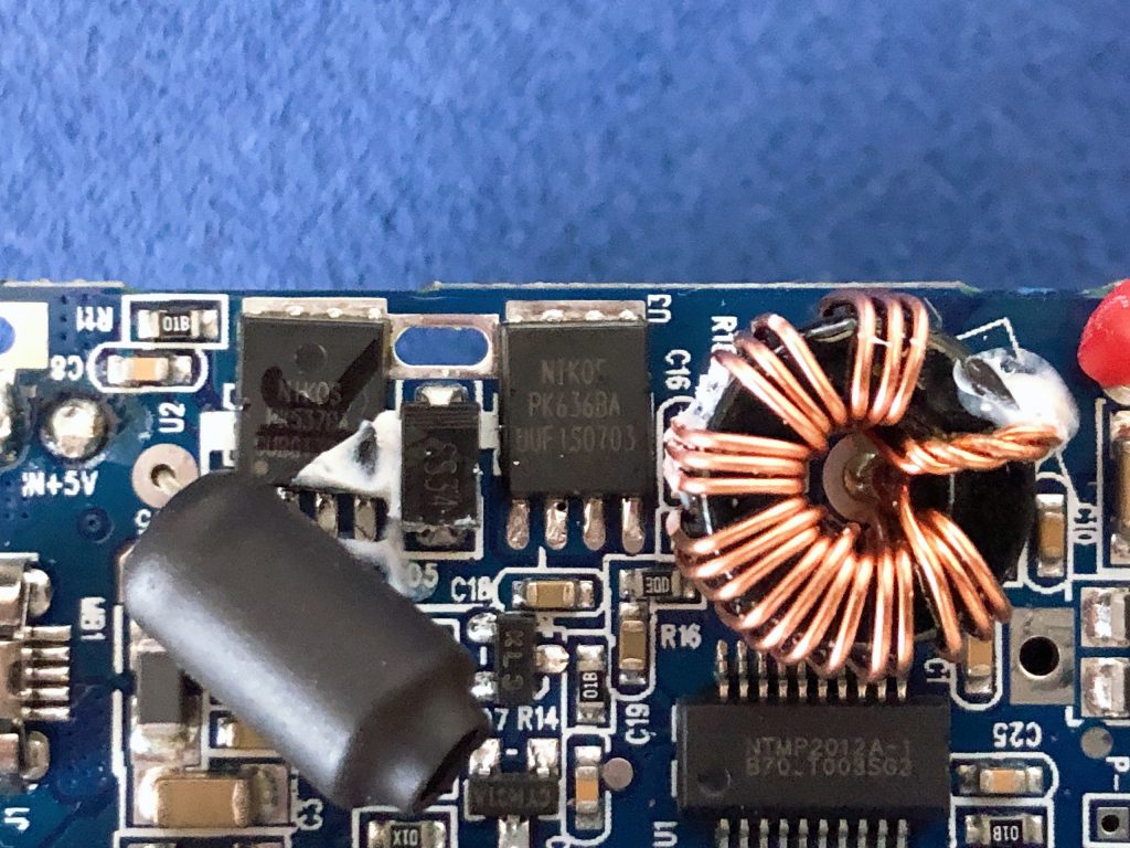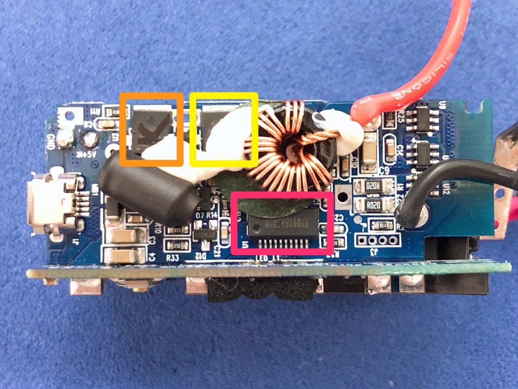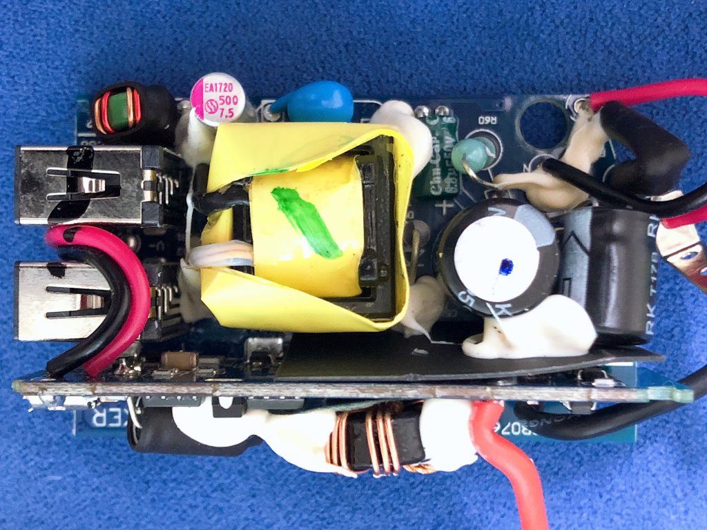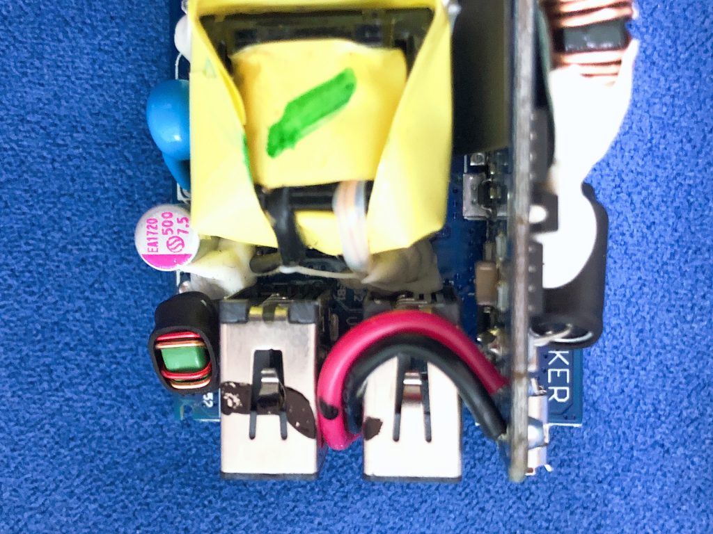 また裏面をよく見てみると二次側から一次側へのフィードバック用素子が見当たりません。おそらくなのですがこの回路は最初にバッテリーを充電し、そのバッテリーを経由してUSBへ出力しているものと考えられます。要は電圧の不平衡をすべてバッテリーが吸収しているということです。