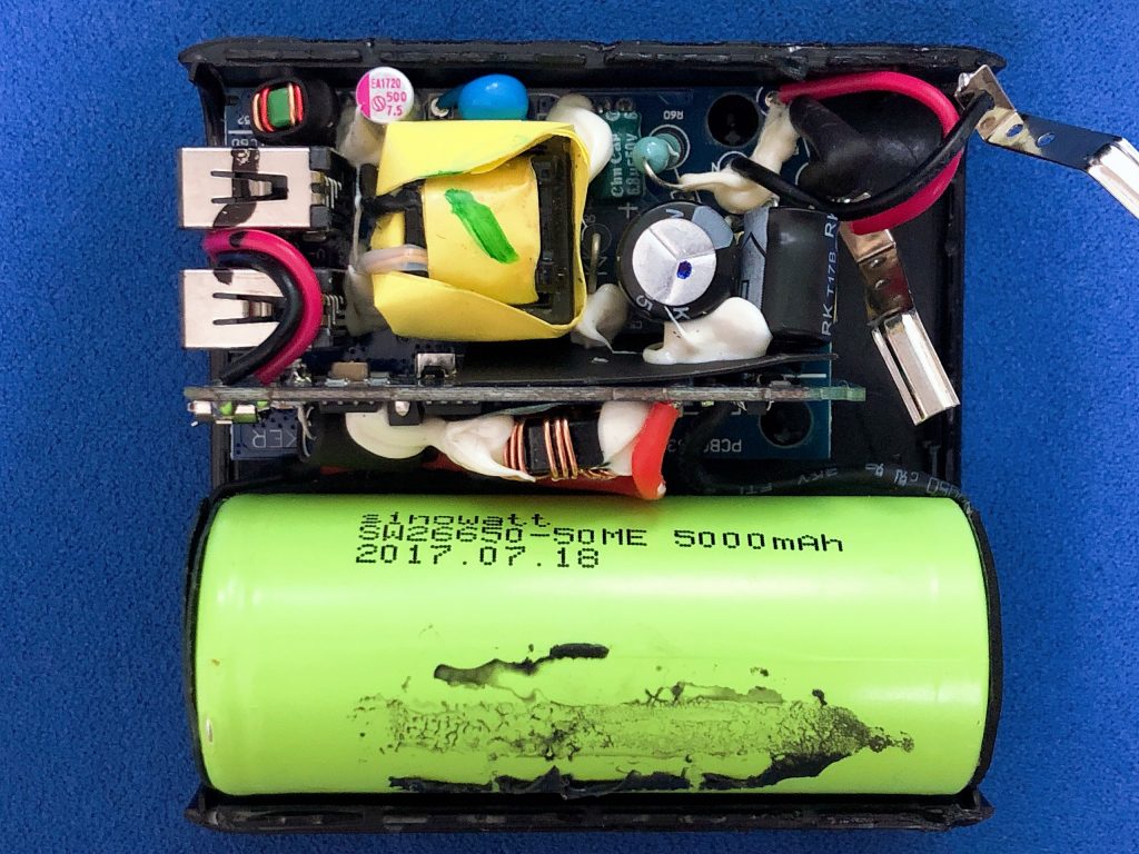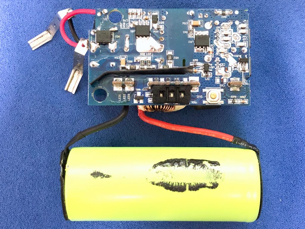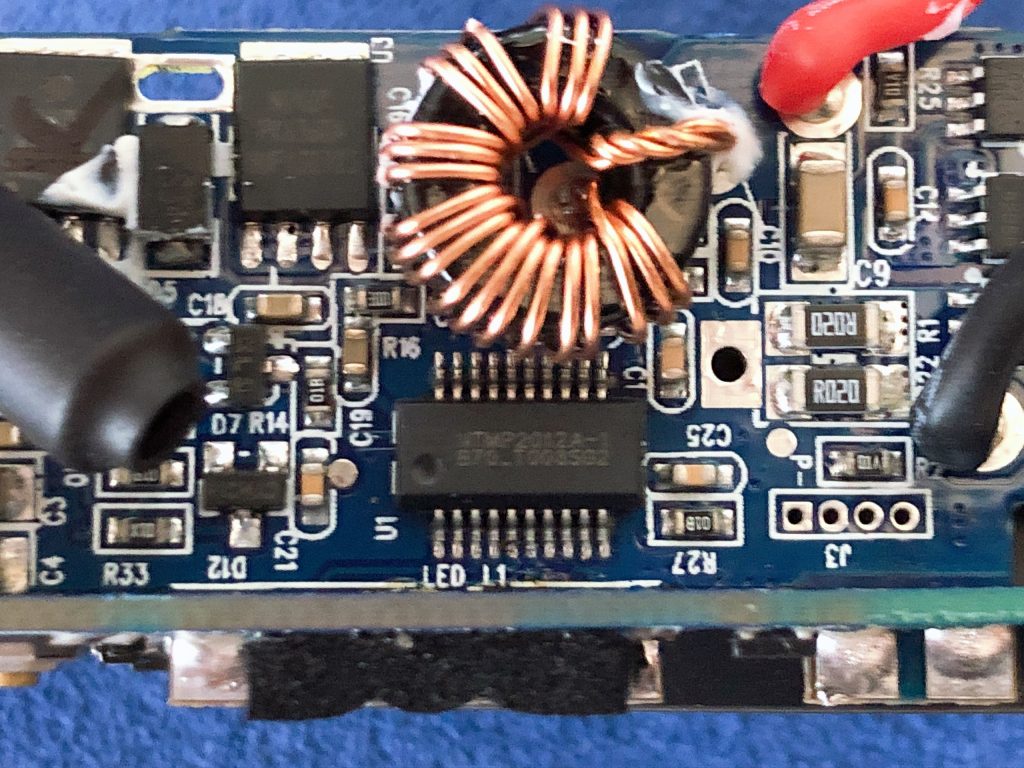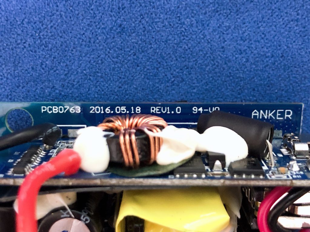 また裏面をよく見てみると二次側から一次側へのフィードバック用素子が見当たりません。おそらくなのですがこの回路は最初にバッテリーを充電し、そのバッテリーを経由してUSBへ出力しているものと考えられます。要は電圧の不平衡をすべてバッテリーが吸収しているということです。