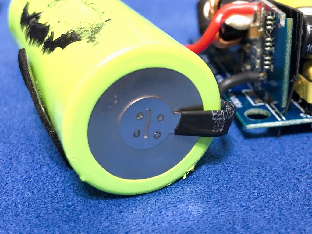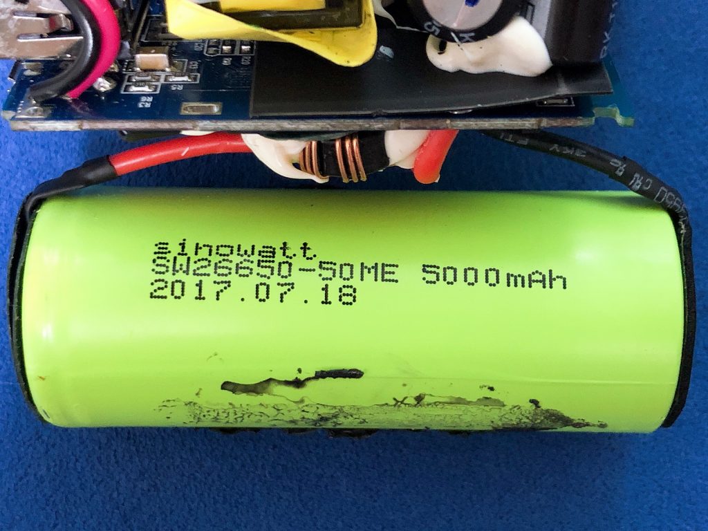 バッテリーはsinowatt製の5000mAhの充電池です。サイズとしては26650に当たり、単2電池の長さを1.5倍に引きのばしたような大きさです。