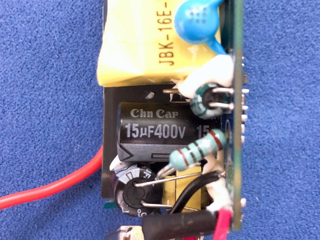 後にも説明しますが、改めて回路の二次側に電解コンデンサがほとんどないのが見てとれると思います。また一次側の方にも大きなFETはありません。これはFETが表面実装となっているためです。