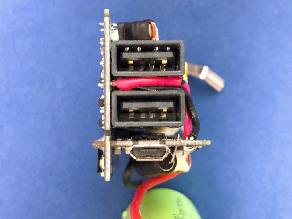 出力端子部です。上のUSB-Aは左の基板に垂直に付いており、下のMicro-Bは下の基板に平行に付いているのがおもしろいところです。